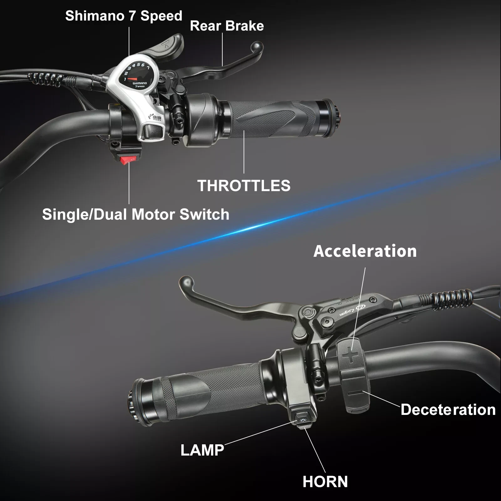 Motor: front motor 48V 1000W brushless gear hub motor, rear motor 48V 1000W brushless gear hub motor. Single motor, dual motor style for you to choose.