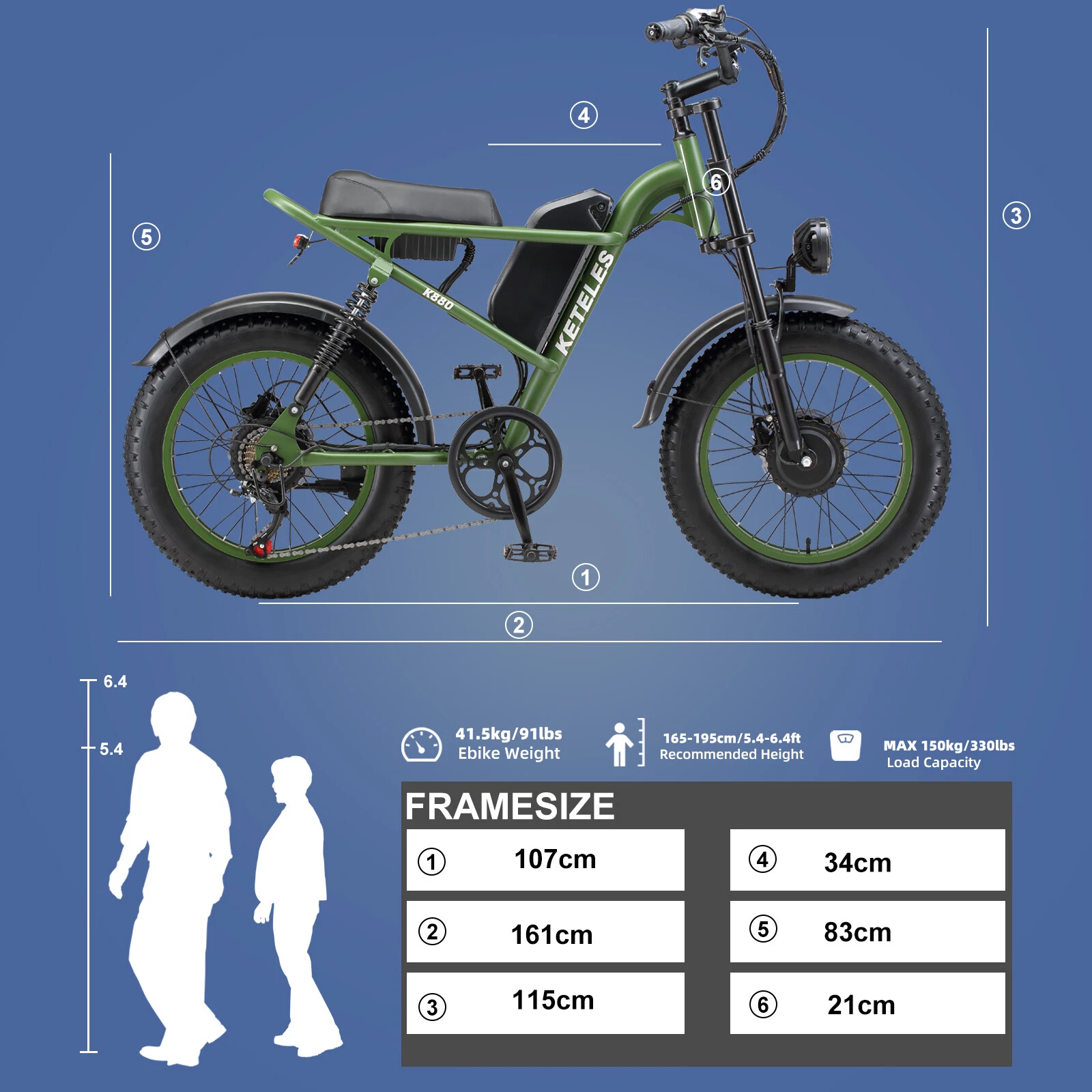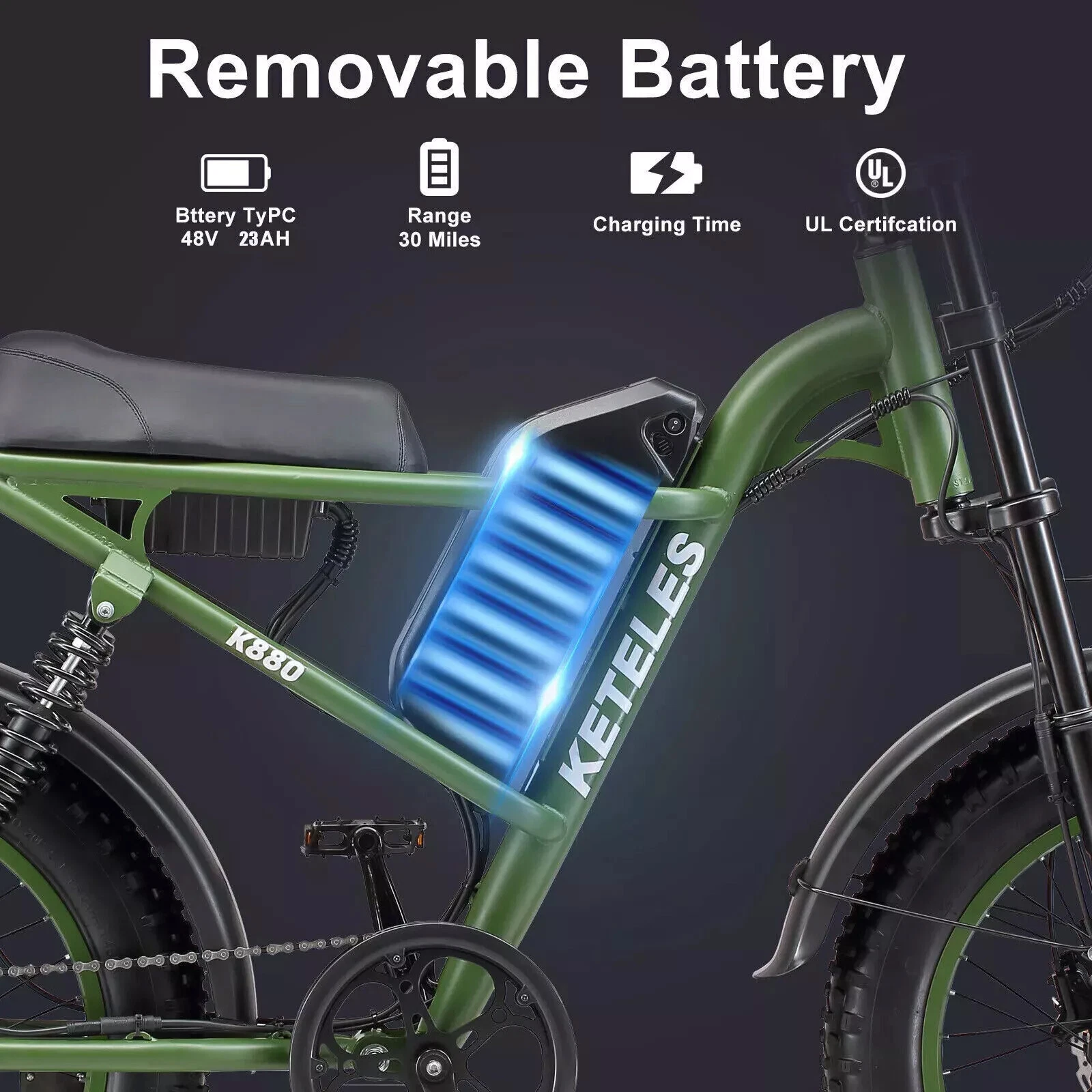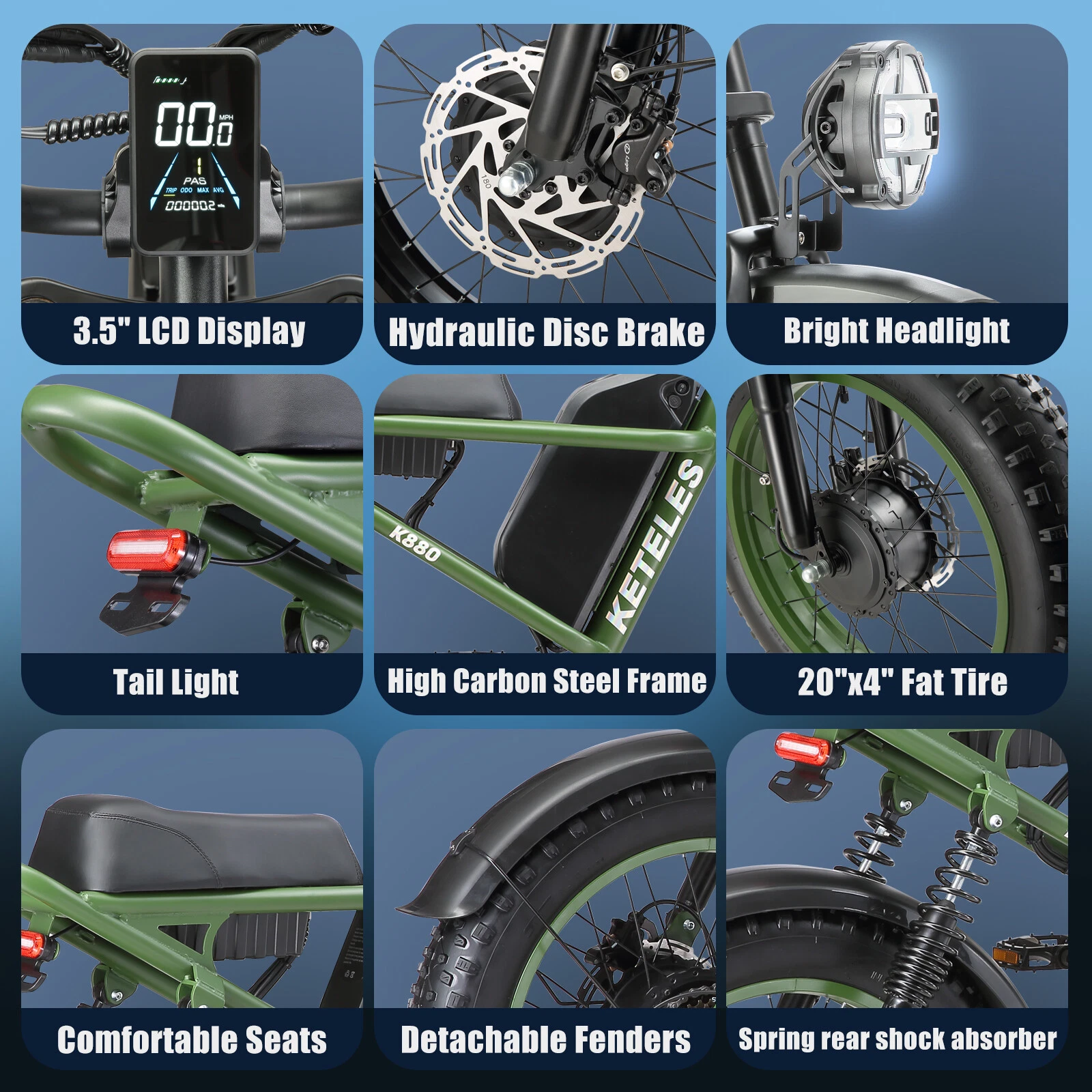 KETELES K880 Adult Electric Motorcycle, 2000W Motor, 23AH/17.5AH Battery, 7-Speed, 20'' Fat Tire Electric Bike