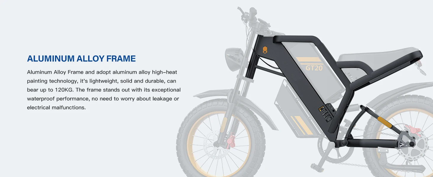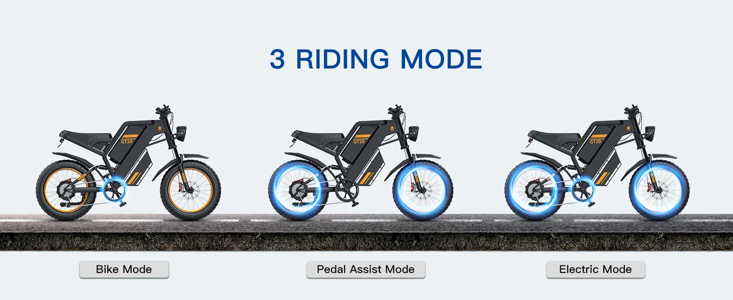 【3 Riding Modes & Riding Comfortably】The GT20 Electric Motorcycle with Electric Mode, Pedal-Assist Mode, Bike Mode. Double suspension shock absorbers, 7-Speed gears, classic angel eye headlight, front & rear turn signal lights, LED brake light, large-sized LCD display, providing you with a comfortable and stable riding experience. Whether it's shortening your commuting time during workdays, or exploring new trails outdoors on weekends, this electric bicycle for adults is a great choice.