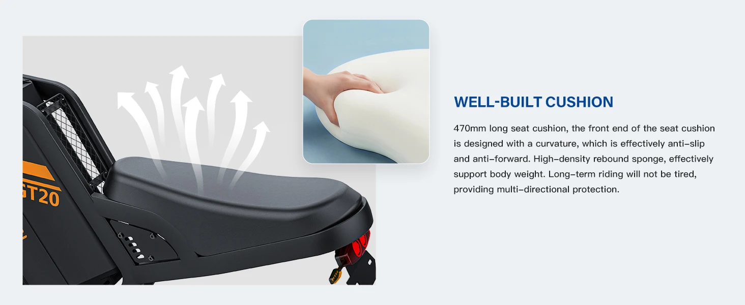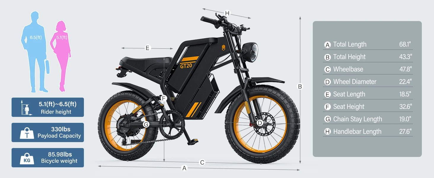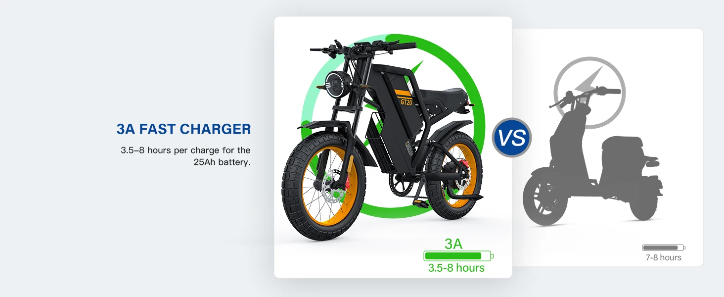 【Single/Dual Removable Battery】The GT20 electric motorcycle for adults is equipped with 48V25Ah single battery/48V (25Ah + 15Ah) dual batteries/60V (25Ah + 15Ah) dual batteries , which are UL certified and have a BMS system. Full battery charge takes 3.5-8 hours, each charge can provide up to 62/80 miles in electric mode and 93/145 miles in pedal-assisted mode. Fulfilling all of your distance expectations and allowing you to go anywhere you want.