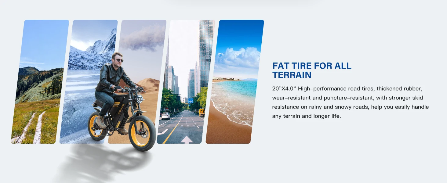 【High Safety Performance Design】① 20" x 4.0" Fat Tires (All Terrain, Directional Tread, High-Density) have high wear resistance and super grip ability, and the tread design reduces rolling friction and side slip, adds protection while cornering in various roads and weather conditions, ensuring smooth riding. ② Efficient Hydraulic Disc Braking system for both front and rear wheels, braking more timely, high-speed emergency braking can also stop in seconds, give you more control over your ride.